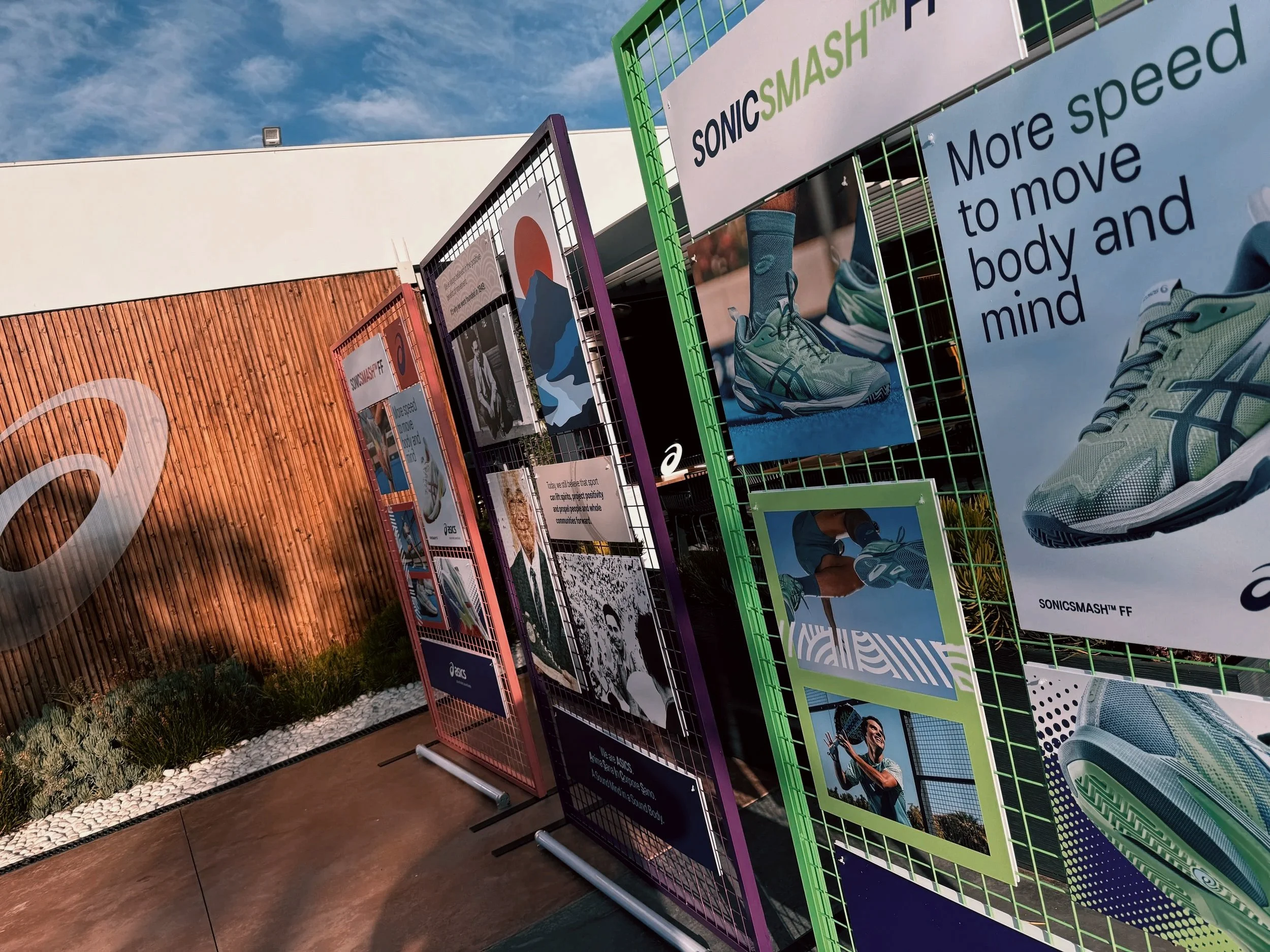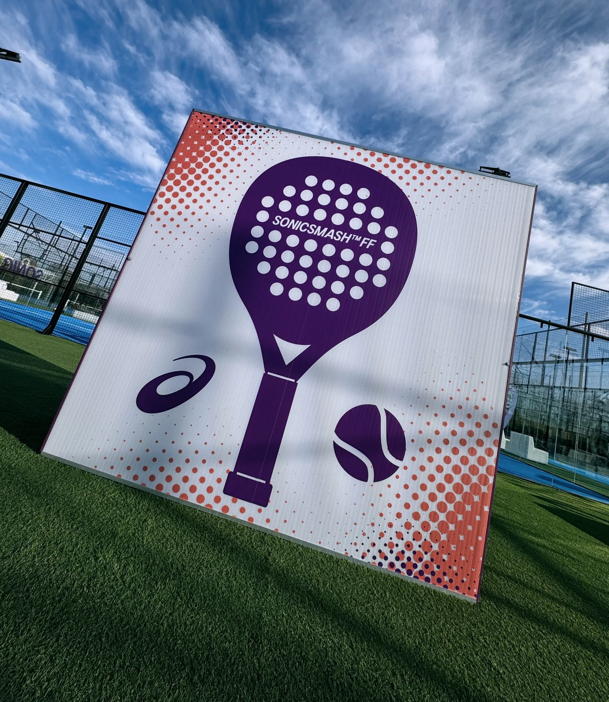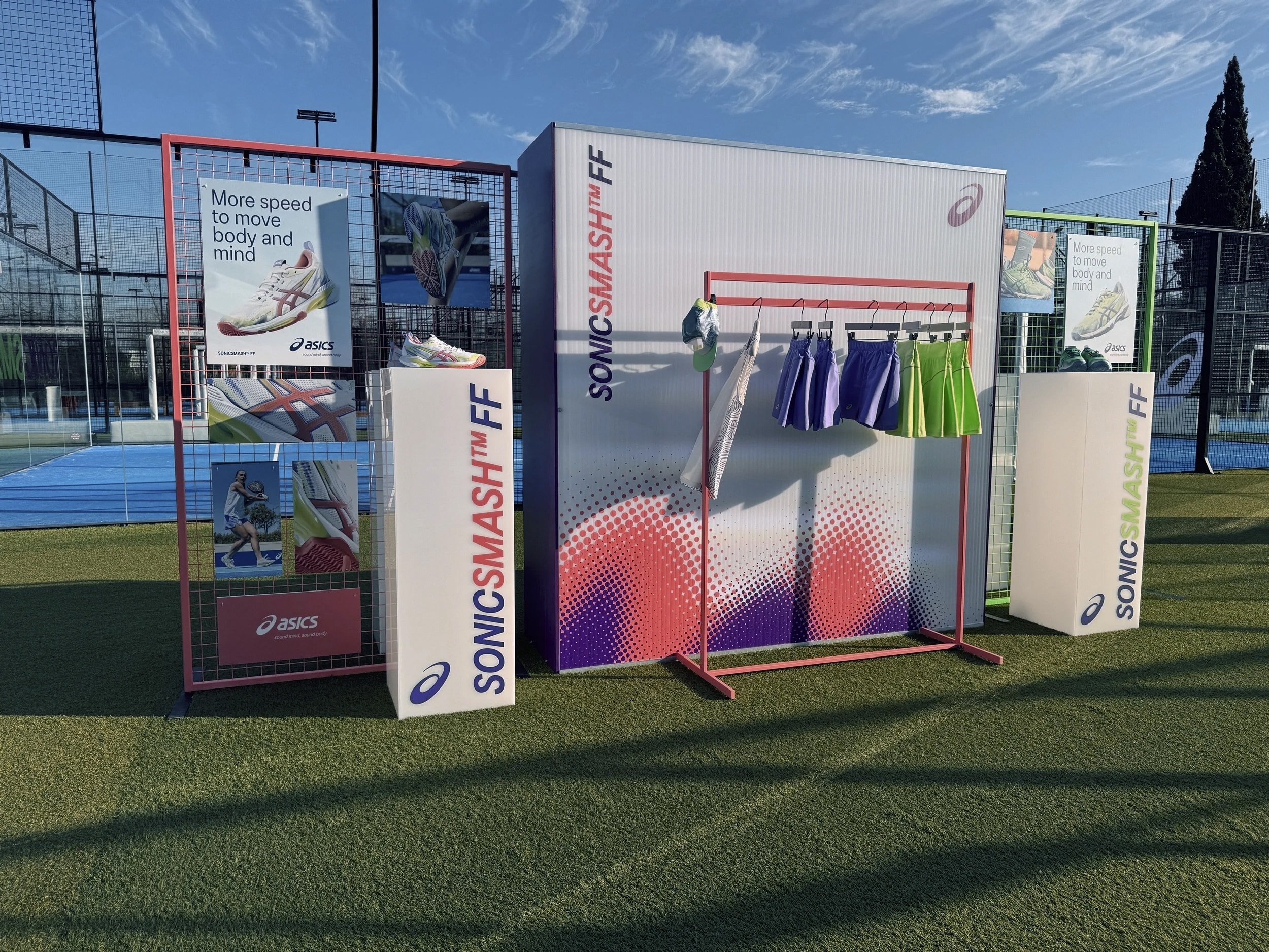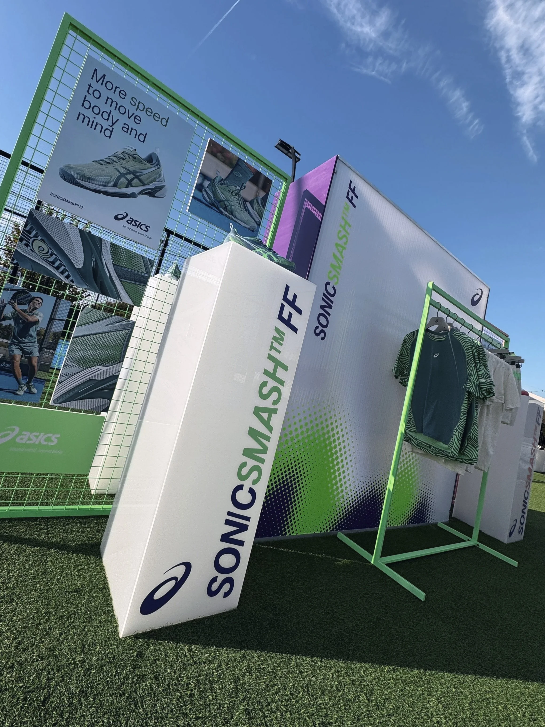 It was a brand-centered launch/demo experience designed to get players, influencers, and media interacting with the new ASICS padel product in a fun setting.